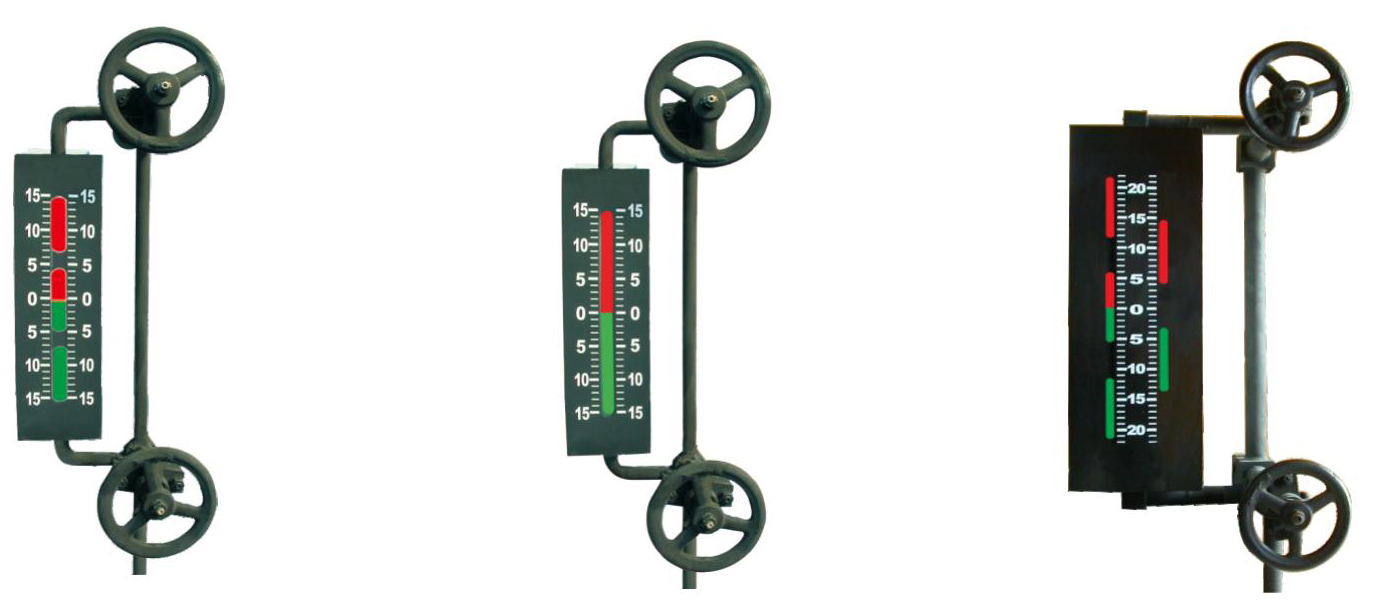五窗、七窗、九窗水位表觀察孔在表體的兩條直線上,通過將觀測(cè)孔交錯(cuò)組合消除了中間盲區(qū)。由光源發(fā)出的光通過紅、綠濾色鏡片,射向水位表體液腔,在表面內(nèi)汽相部分,紅光射向正前方,而綠光斜射到壁上被吸收。而在表體內(nèi)液相部分,由于水的折射使綠光射向正前方,而紅光斜射到壁上被吸收。因此在正前方觀測(cè)將獲得汽紅、水綠、汽滿全紅、水滿全綠的顯示效果。