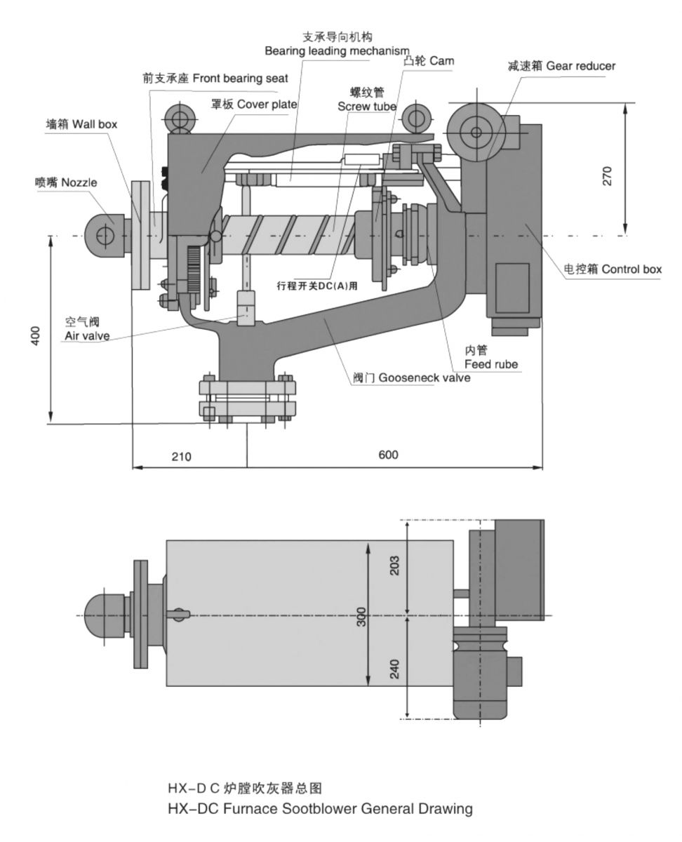 HX-DC吹灰器主要由鵝頸閥、內(nèi)管、吹灰槍與噴頭、減速傳動機構、支承板、導向桿、電氣控制機構、防護 罩組成。